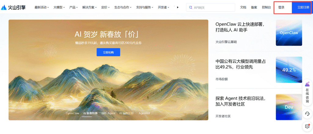 登录后,击右上角导航栏中的“控制台”,或直接访问控制台地址 https://console.volcengine.com/home