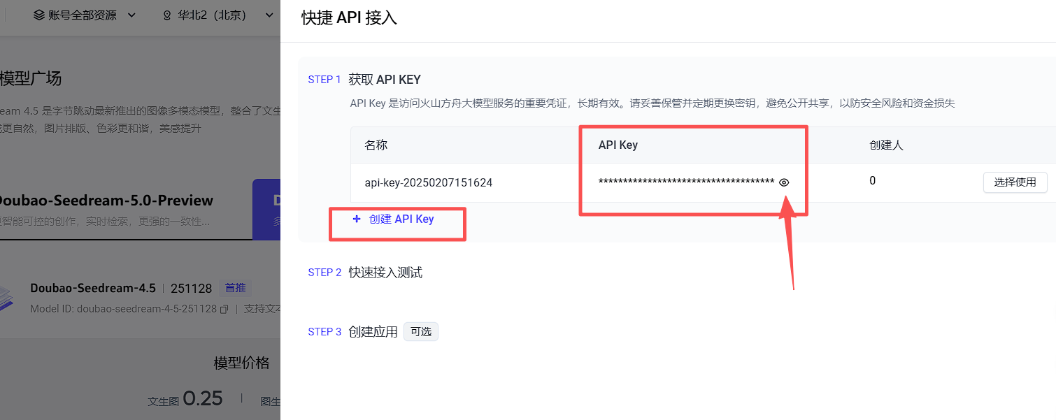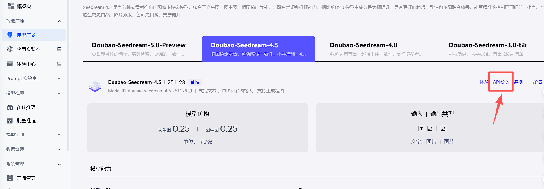 (1)下拉页面找到“图片生成”模型列表中的“Doubao-Seedream-4.5”,点击它,然后点击 API接入