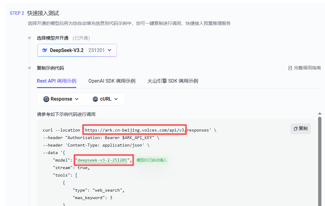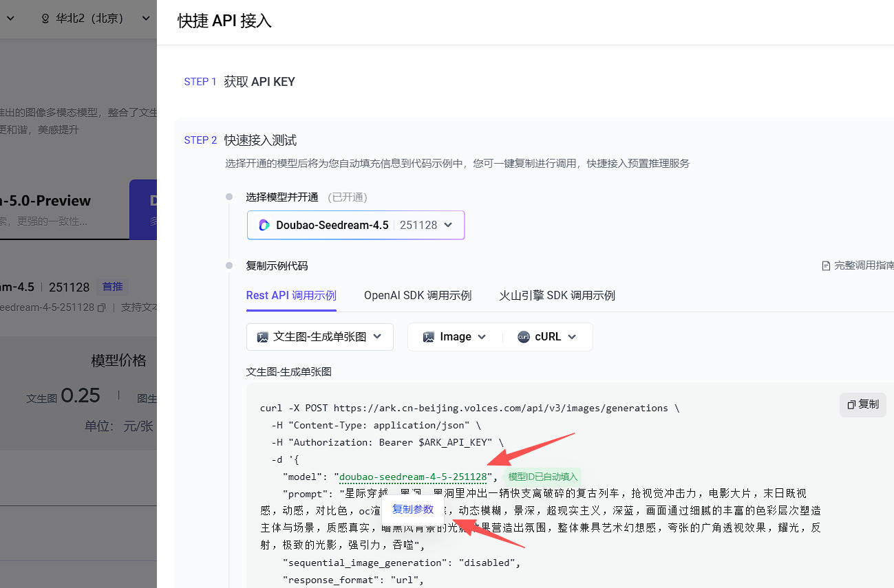 (4)获取模型名称——切换回火山方舟刚才的快捷 API 接入弹窗页面,SETP 2 中,鼠标移动到绿色模型名称上,出现“复制参数”,点击“复制参数”即可复制到模型名称。