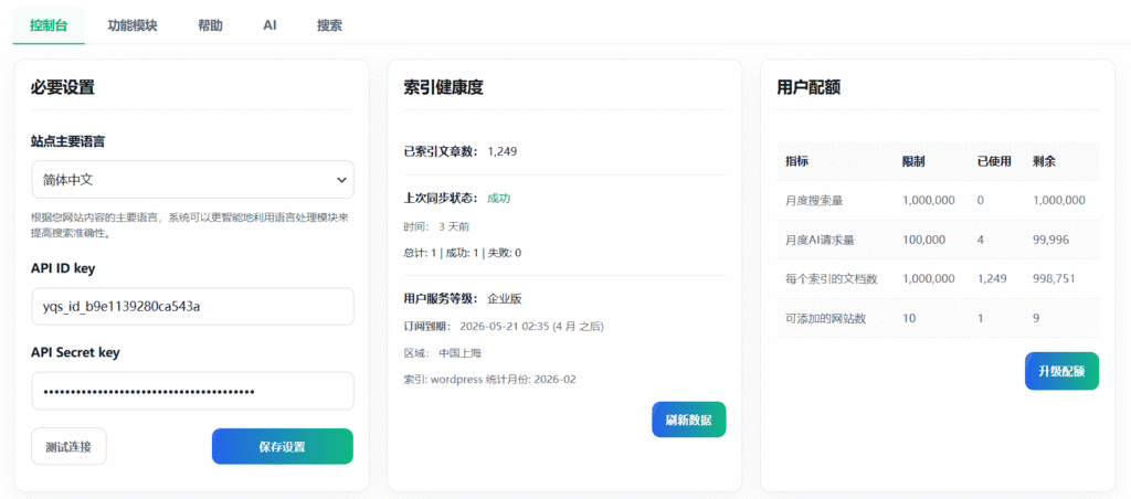- 数据可视化:查看索引健康、同步状态、服务套餐与额度,并可通过SaaS平台查看搜索详细数据