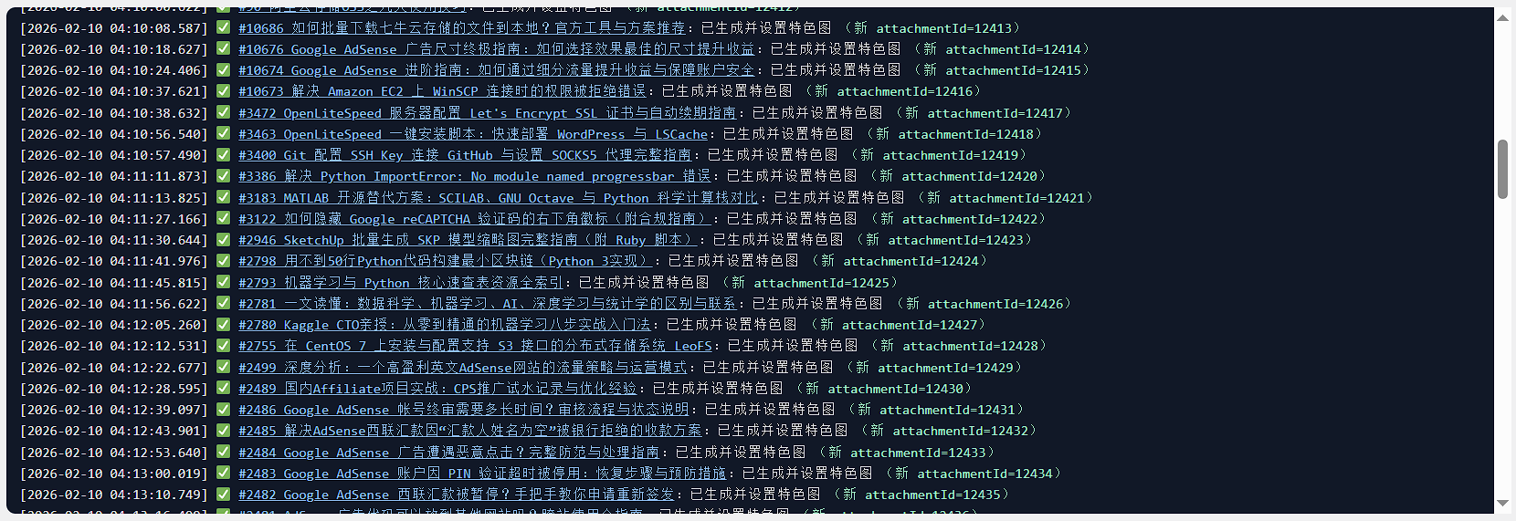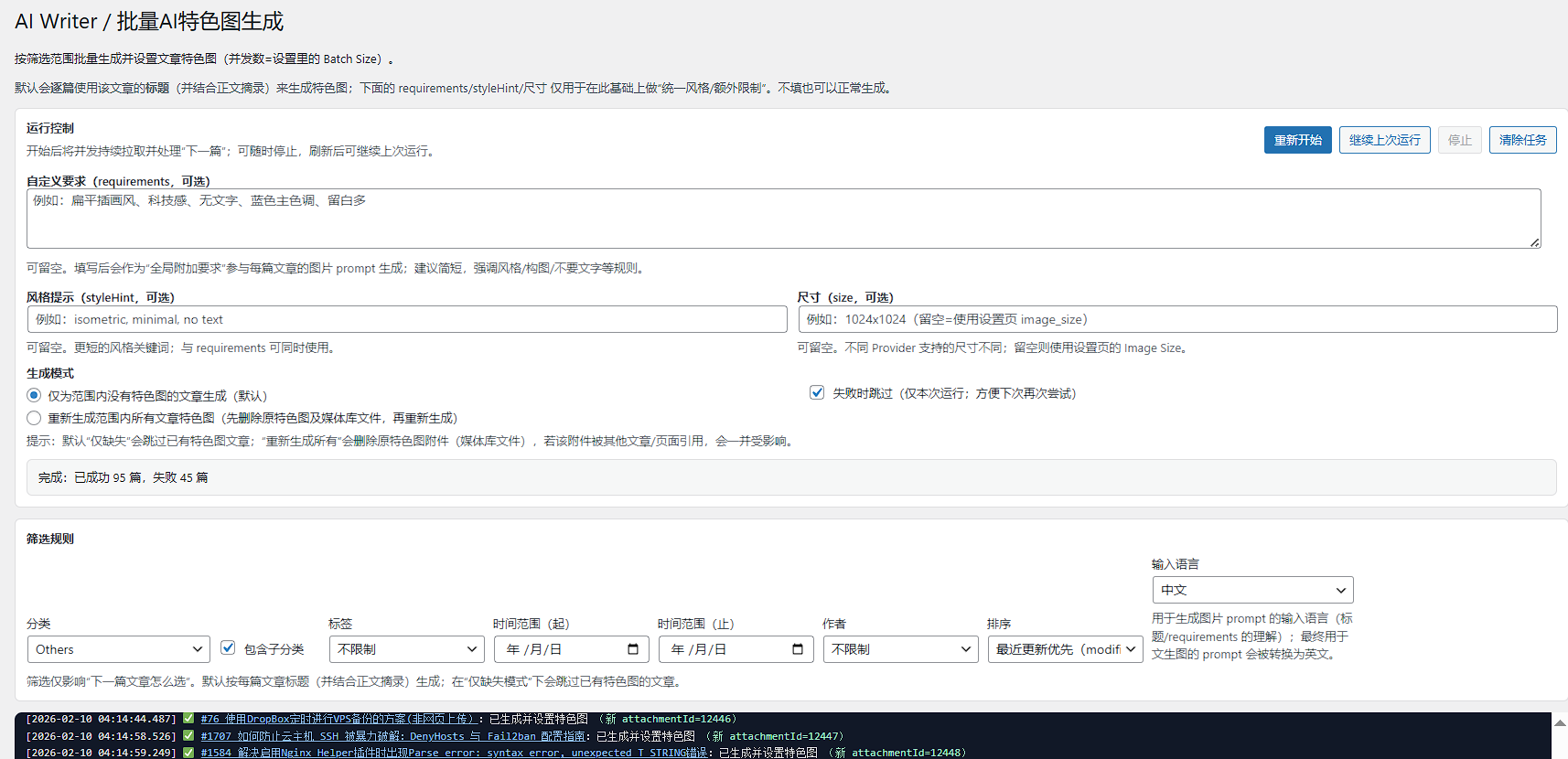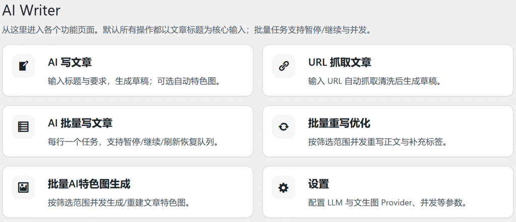 - 批量 AI 特色图生成:为指定范围的文章批量生成并设置特色图,支持“仅缺失”或“重新生成所有”模式。