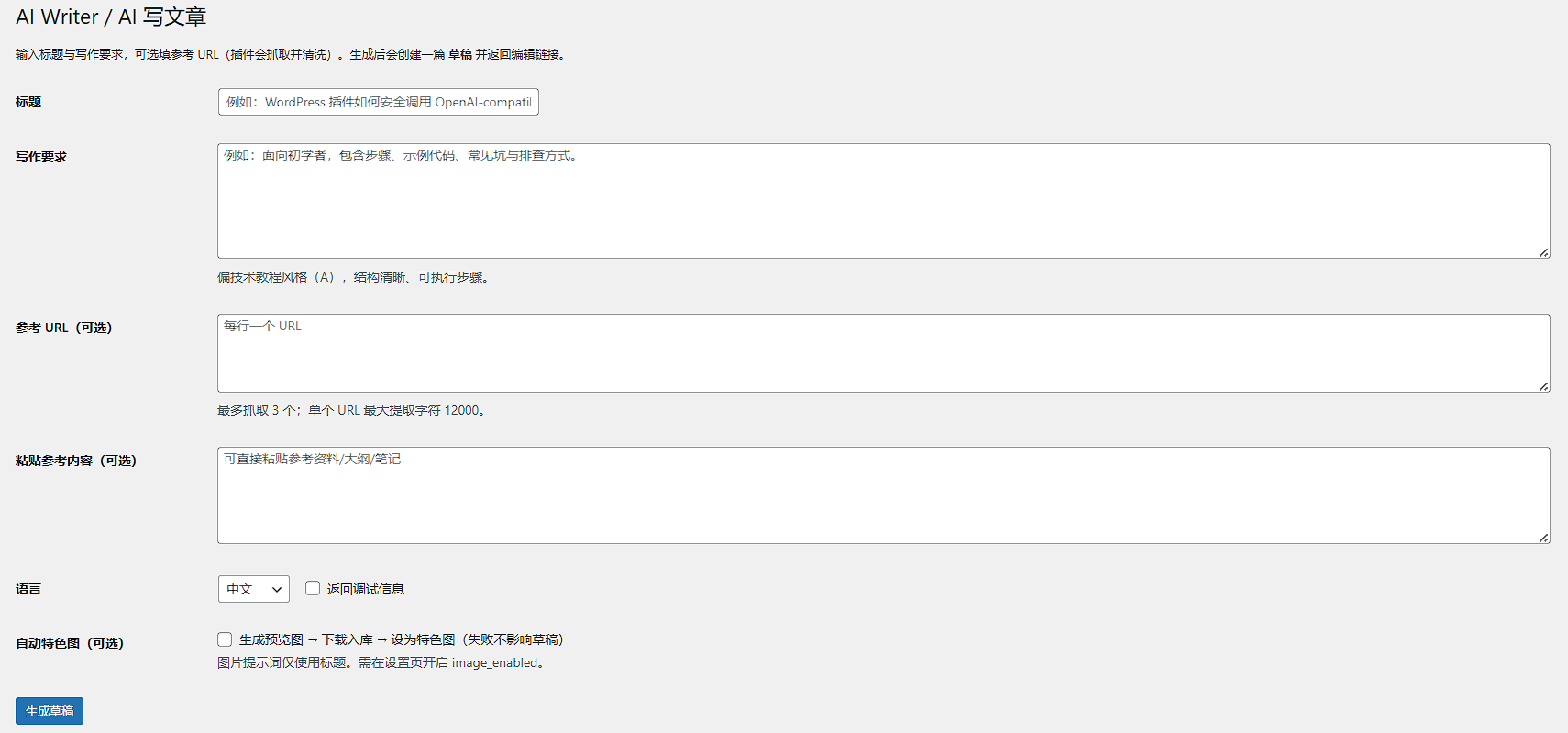 必填标题,可选写作要求、参考 URL 等。生成后创建草稿并返回编辑链接,可选自动生成特色图。