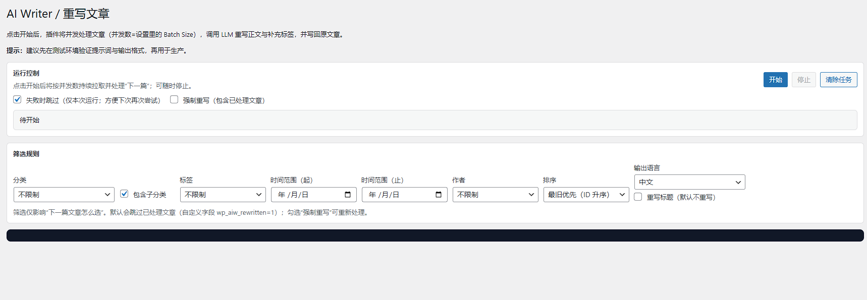 按分类、标签、时间等筛选文章进行并发重写,覆盖写回原文章。支持开始/停止/继续,状态保存在浏览器本地。