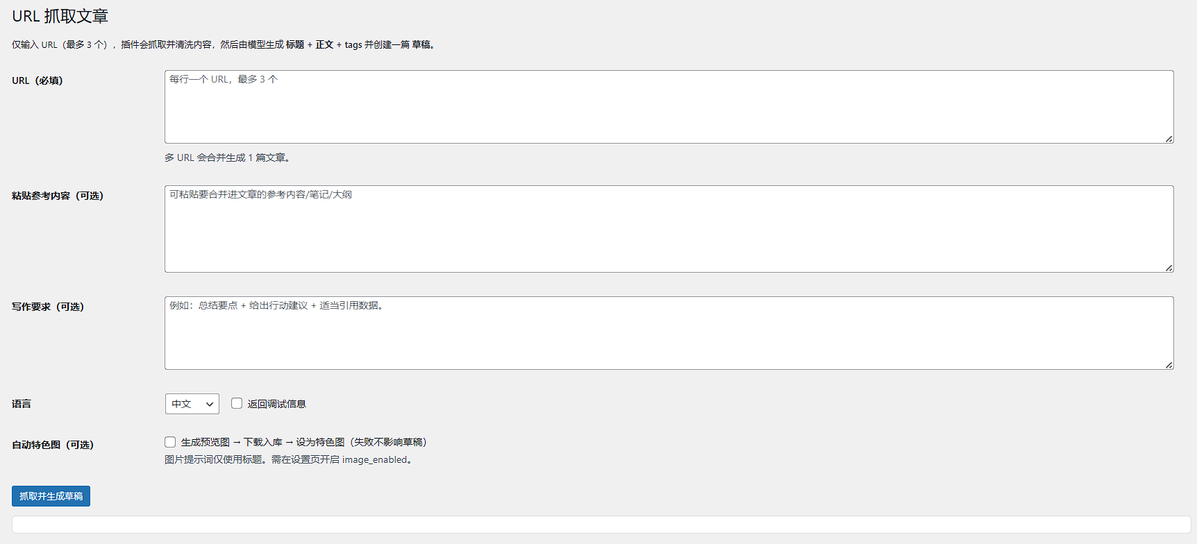 输入 URL(每行一个,最多 3 个),插件会抓取内容并生成文章草稿。部分 URL 失败会告警并继续。