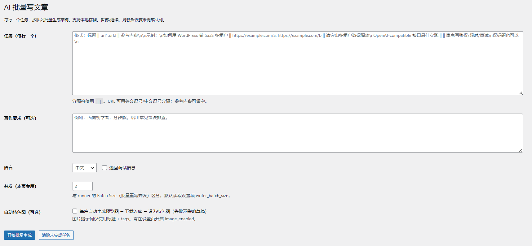 - AI 批量写文章:支持队列并发生成草稿,可暂停/继续,支持自动生成特色图。